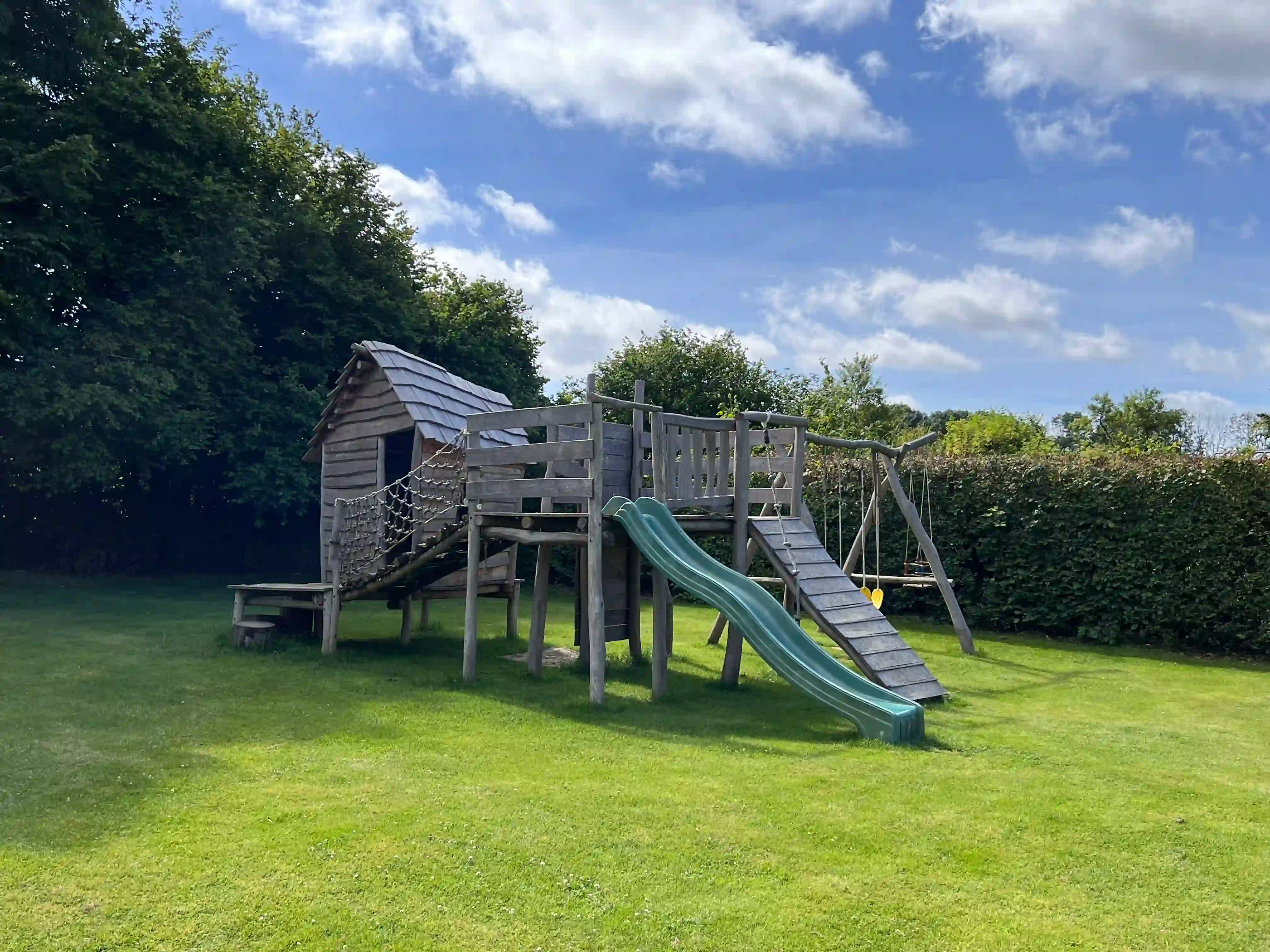- grande aire de jeux avec équipements : balançoires, mur d'escalade, toboggan, maison de jeux