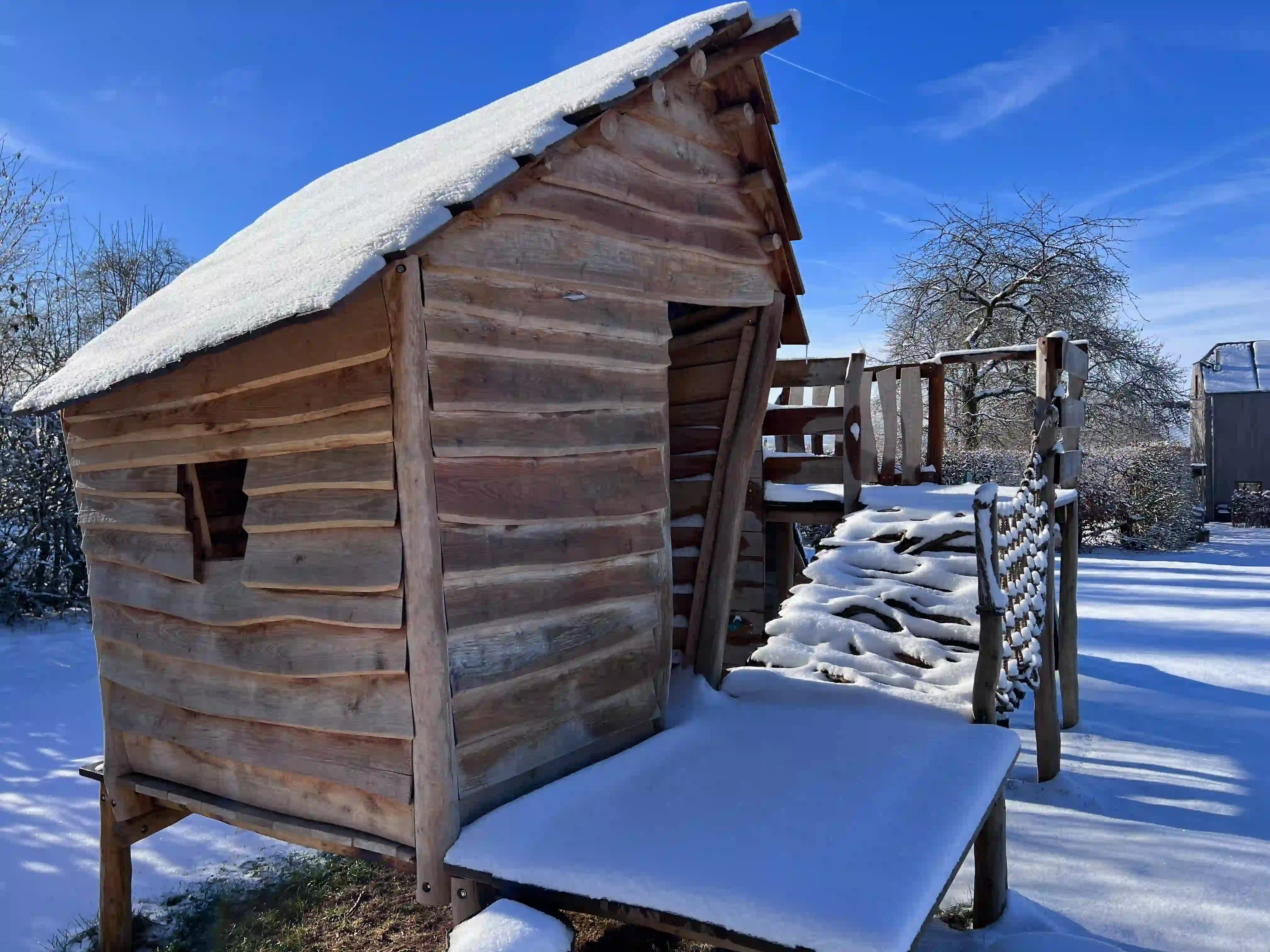 grote speelweide met speeltuig: schommels, klimmuur, glijbaan, speelhuis